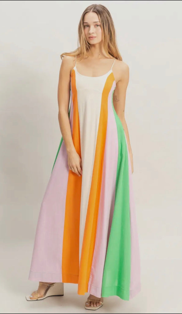 Bright and colorful color block maxi. Spaghetti straps, button detail on side and tie detailing.
