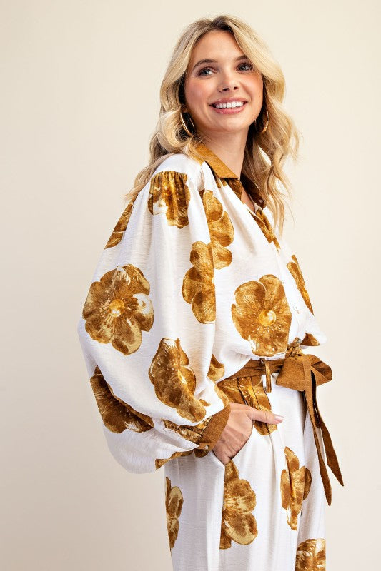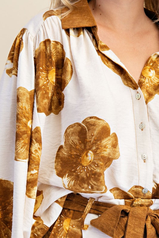 Golden yellow flowers in this gorgeous fall floral printed top. Style with denim or black denim for a stylish fall fit.