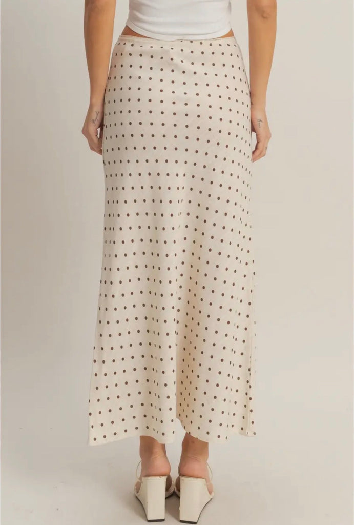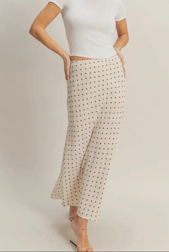 Oatmeal elastic waist skirt with all over brown polka dots. We love it as a set or styled with a cute baby tee. Polka dots are trending. Love this.