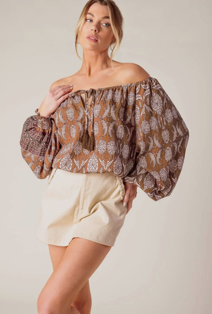 Give us all the prints and this one is perfect for fall. Can be worn on the shoulder or off. Front tie tassel detail and loose cuffed sleeve.